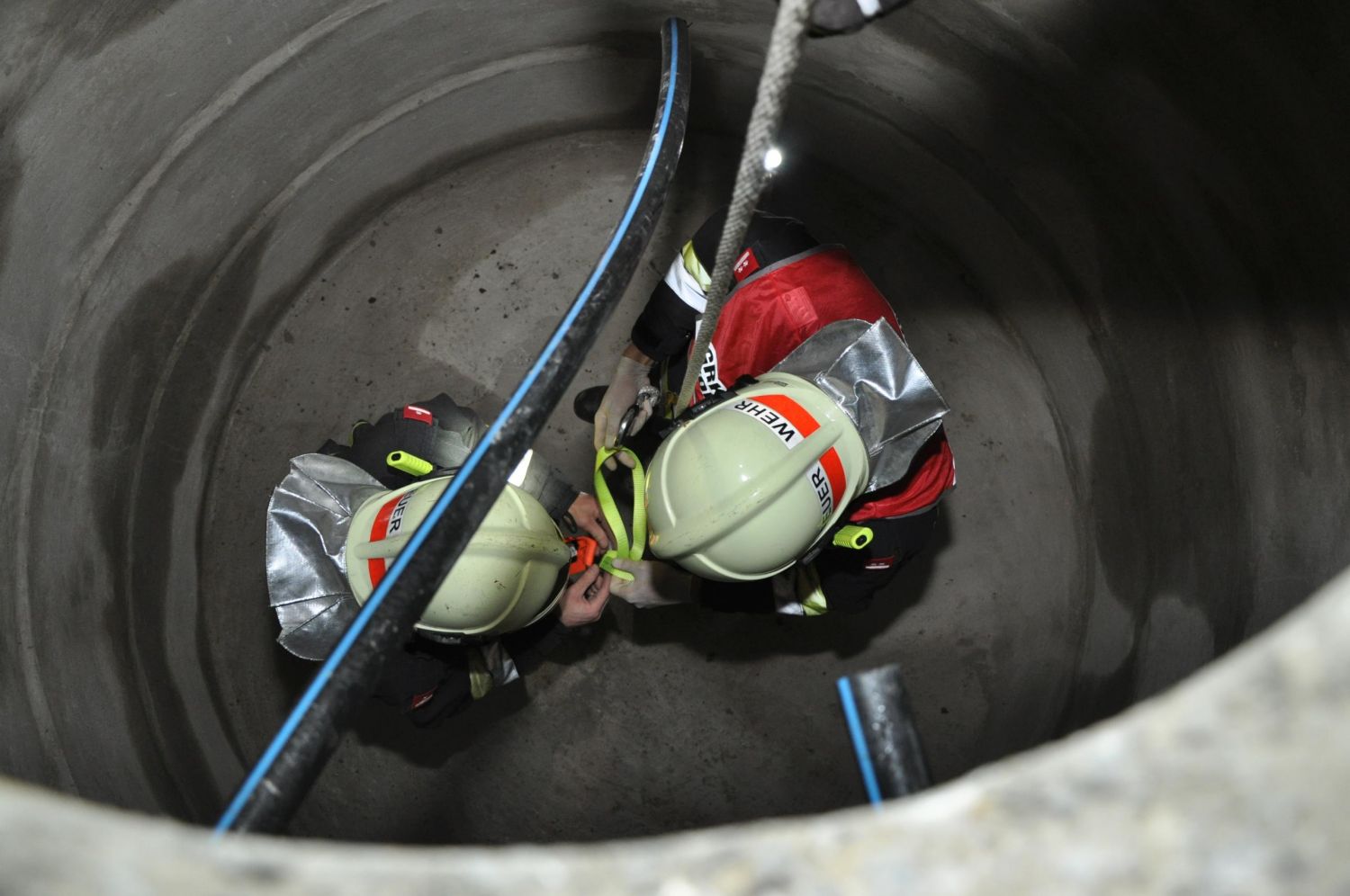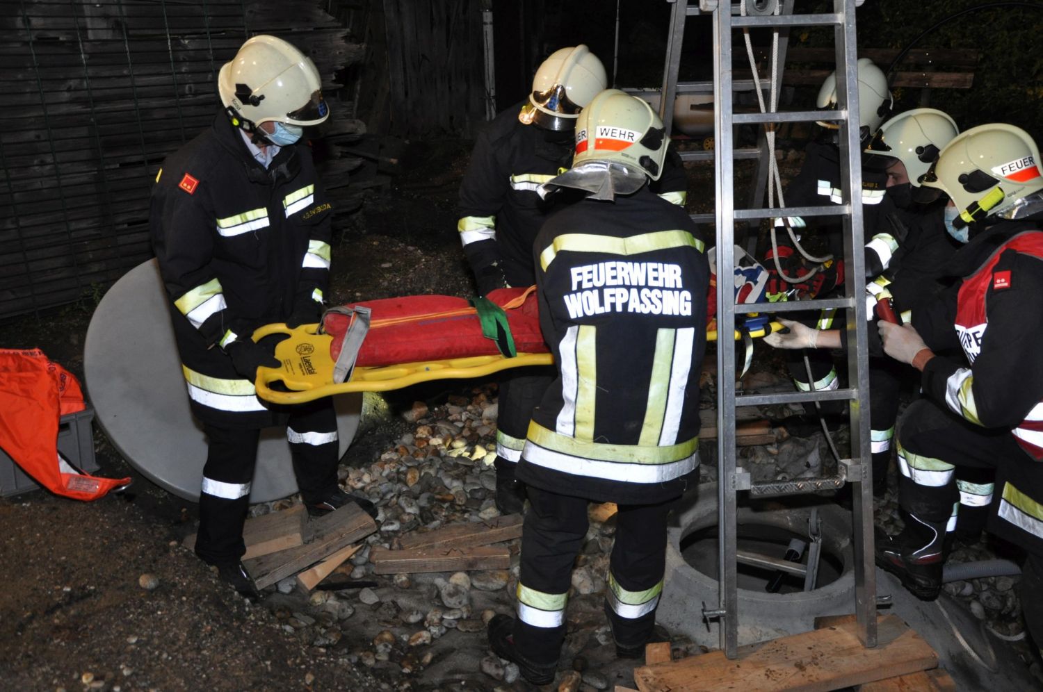 Am 12. 10. stand das Thema Schachtbergung am Übungsplan: Nach Erkundung mit Gasspürgerät hat der Gruppenkommandant 2 Einsatzkräfte mit Atemschutz in den Schacht abseilen lassen um die Übungspuppe mittels Spineboards durch die Schachtöffnung zu retten - natürlich unter Einhaltung aller Corona Regeln.