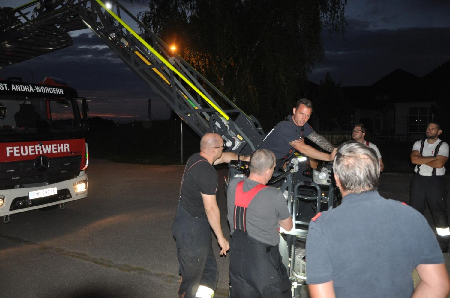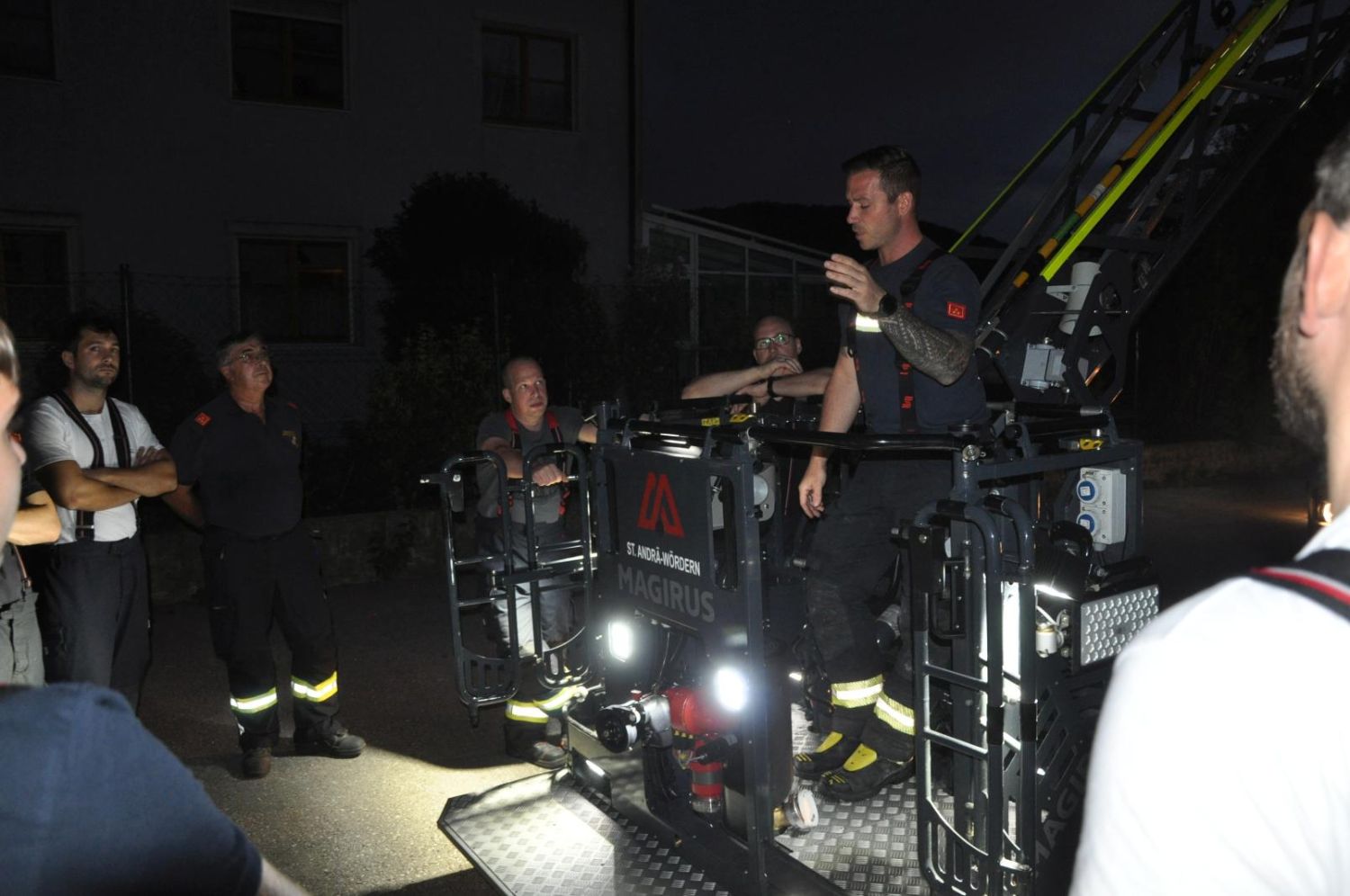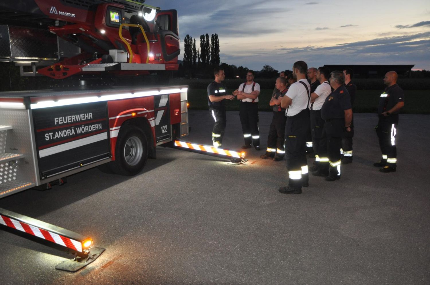 Am Montag, den 22. September, führten wir gemeinsam mit der FF St. Andrä-Wördern und der neuen Drehleiter eine Übung durch. Wir erhielten eine beeindruckende Einweisung in die vielfältigen Einsatzmöglichkeiten des neuen Fahrzeugs. Im letzten Teil der Übung ging es darum, den besten Standort für eine Menschenrettung in den Wohnbauten in der Brucknergasse zu ermitteln.