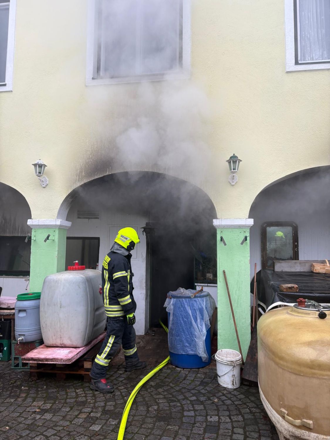 Beim Eintreffen stellten wir fest, dass der Brand im Heizraum ausgebrochen war. Das dort gelagerte Brennholz hatte Feuer gefangen.